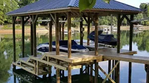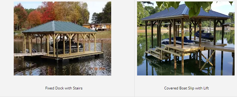 Docks: A dock is wider than a pier and can be fixed or floating. Floating docks, like their name indicates, have flotation devices attached underneath that allow them to float in the water. On the other hand, fixed, docks are attached directly to the pilings and do not rise and fall with the lake level. With a fixed dock you access lake by stairs and/or a boat lift. If your property gets a lot of wake, a fixed dock can substantially reduce the wear and tear on your dock. In the past, fixed docks were more expensive than a floating dock. Today most dock builders say they have similar costs.
