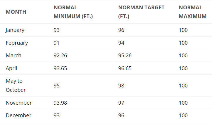 I want to point out that the lake level is based on a reading of a 100 ft at full pond which corresponds to the 760 typographical line. Think of it this way, at 93.1 ft the lake was 6.9 feet lower then when it is full.